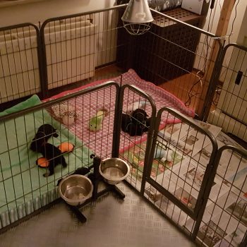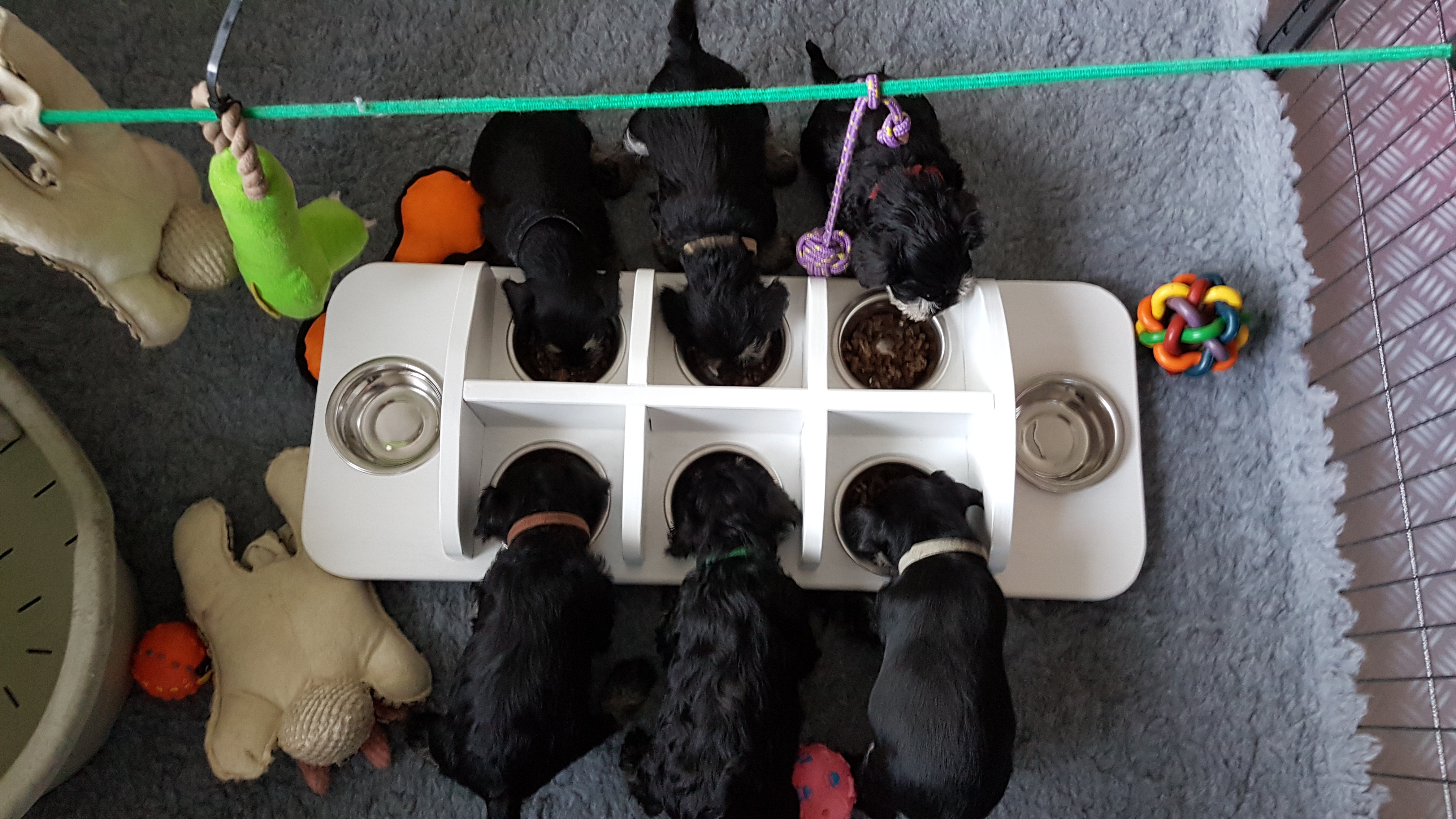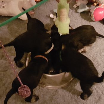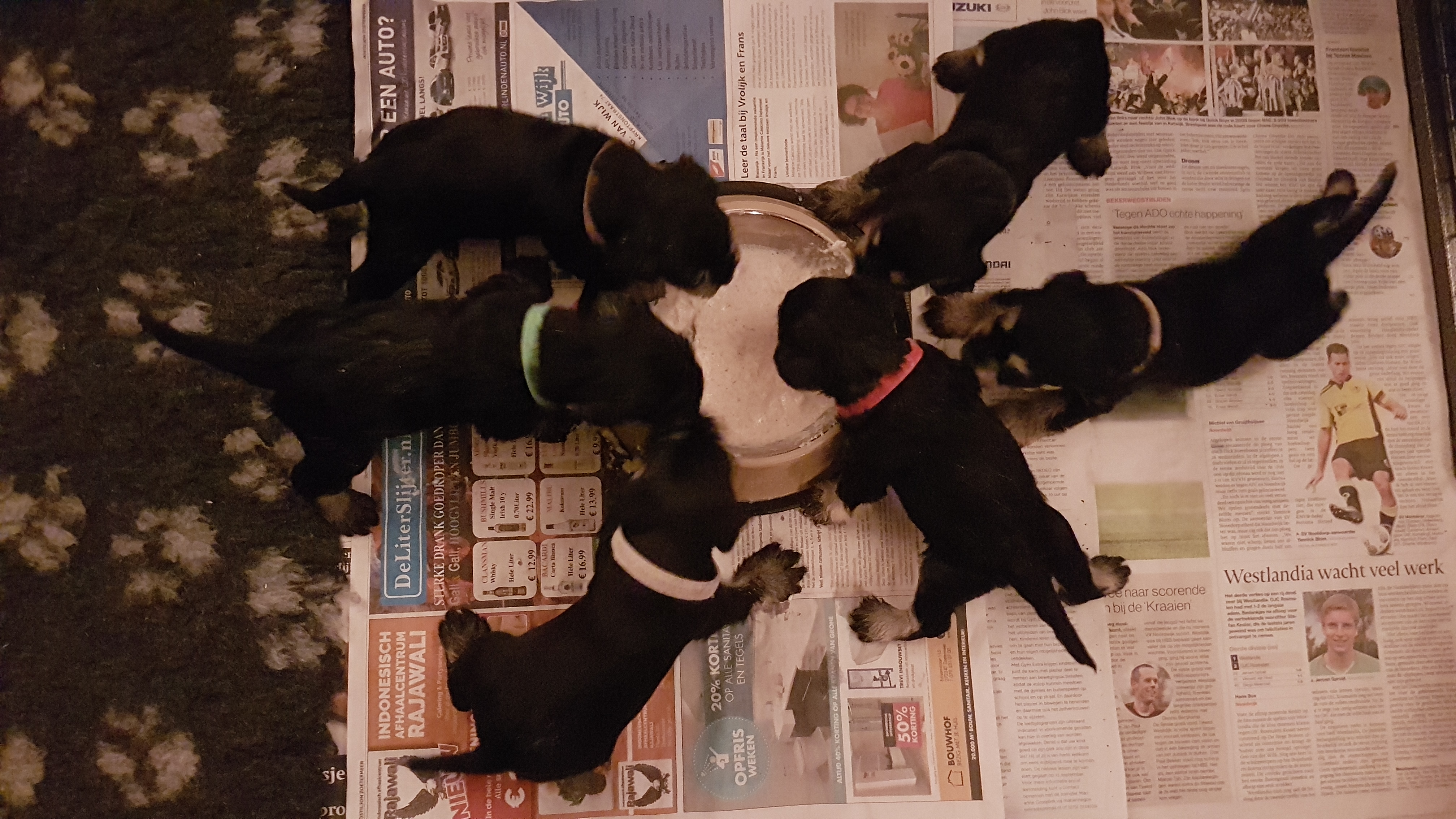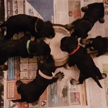 Toen de pups 16 dagen oud waren gingen langzaam ook de oortjes open. Toen ze 3,5 week waren is langzaam begonnen met het overgaan naar vast voedsel, eerst pap en daarna (geweekte) brokjes en vers vlees.